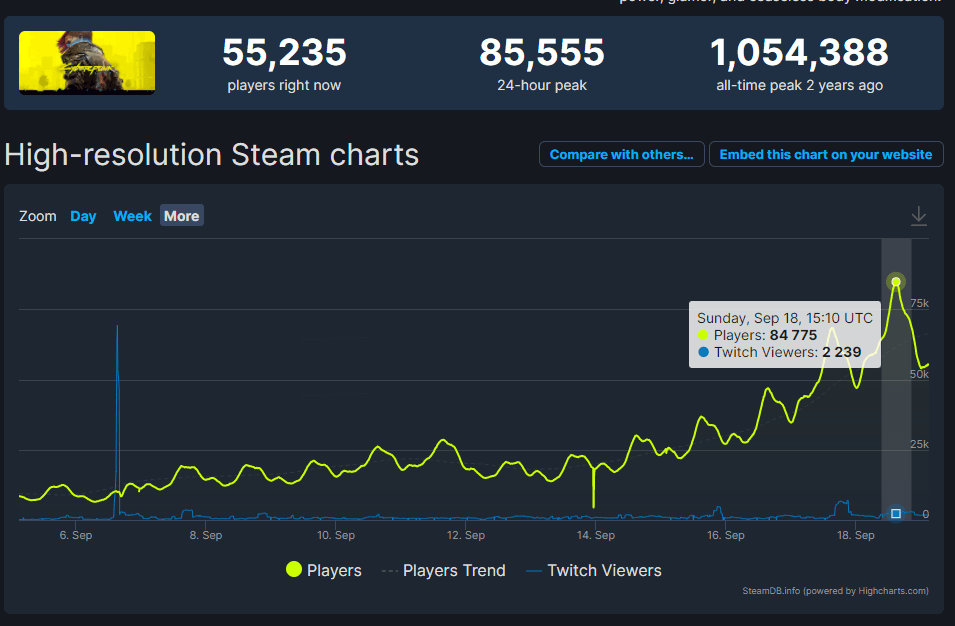 【8万人重回2077暴打亚当重锤】《》衍生动画《》(Cyberpunk: Edgerunners)口碑/热度双双爆棚之后,《赛博朋克2077》同时在线人数于周日到达了巅峰——85555人,这也是自2021年1月以来的最高在线记录,亚当重锤功不可没。