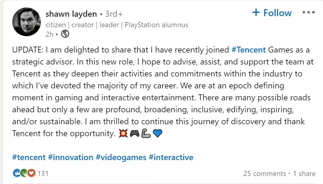 【#索尼前CEO加入腾讯#】前索尼互动娱乐(SIE)北美区总裁兼CEO Shawn Layden宣布,他已经加入腾讯游戏并担任战略顾问的职位。