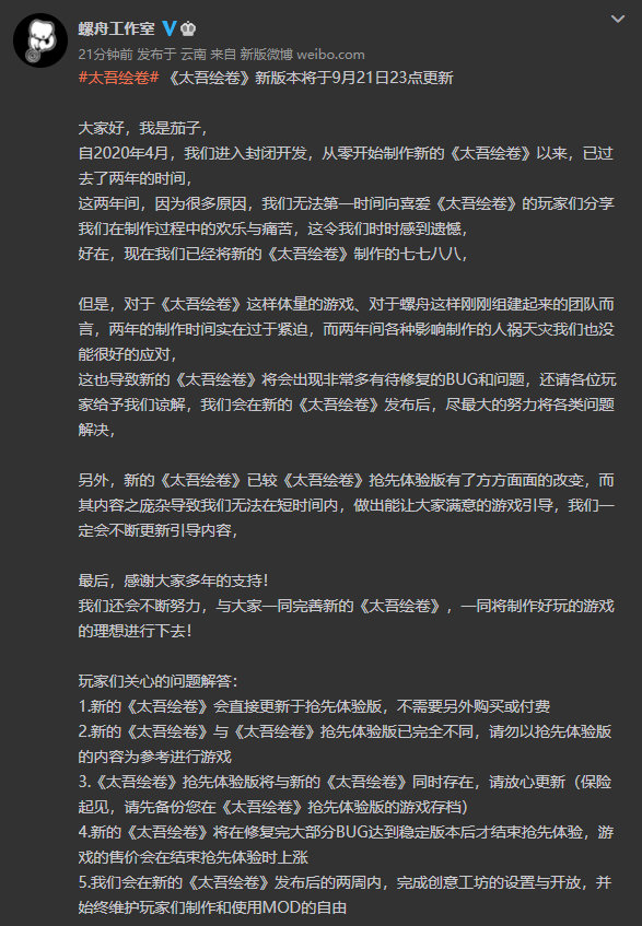 【《太吾绘卷》新版本于9月21日23点更新】《》官方发布公告称新版本将于9月21日23点更新,制作人茄子表示,新的《太吾绘卷》已较《太吾绘卷》抢先体验版有了方方面面的改变,而其内容之庞杂导致我们无法在短时间内,做出能让大家满意的游戏引导,制作组一定会不断更新引导内容。