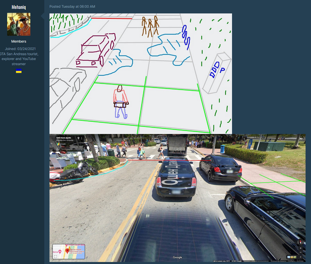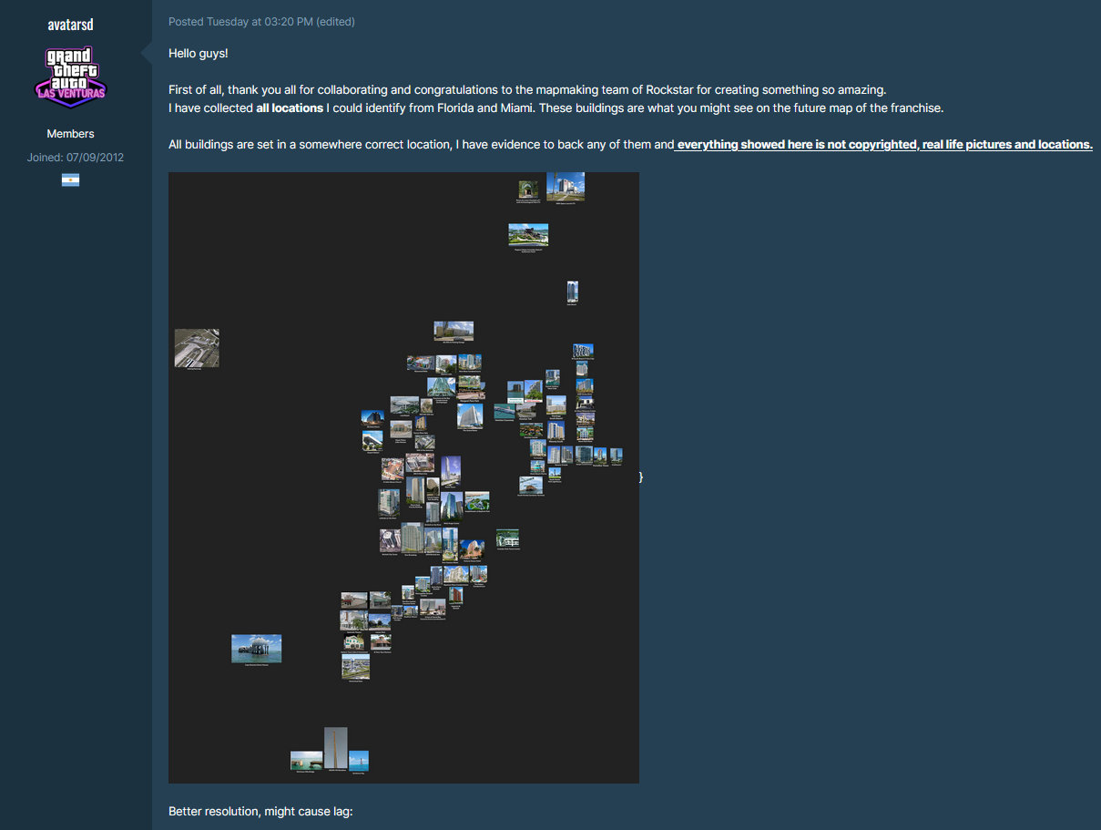 不过依旧有粉丝认为这种做法太过限制,于是有许多人加入私人 Discord 频道在其中自由分享泄露的截图和视频,一些人在泄露的内容中搜索地标,然后根据其他泄露的视频片段和数学计算,试图对它们的位置进行三角定位。与此同时,一些用户会梳理视频的每一帧,将游戏内的小地图截取下来,帮助创建可以连接在一起的地图碎片。而其他粉丝则用他们对佛罗里达和迈阿密的真实了解来帮助填补空白,提供有关高速公路、老建筑或被拆毁道路的信息。