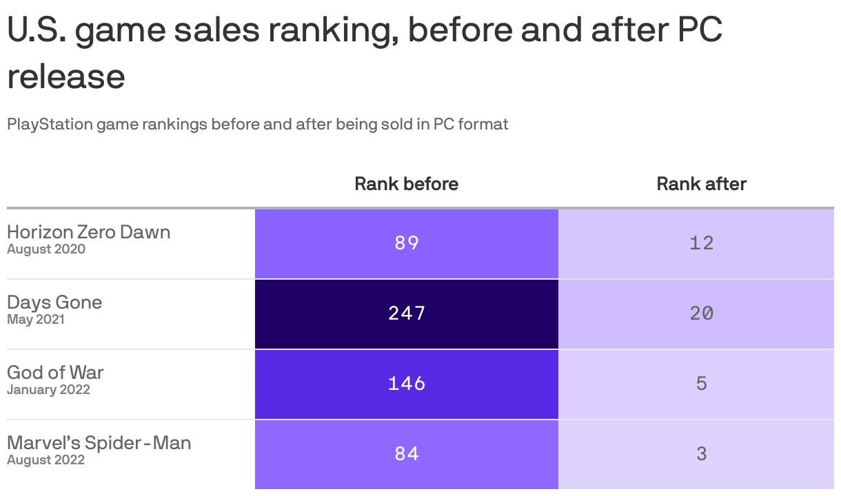 索尼独占游戏在登陆了PC以后收获了大量的新粉丝。《地平线:零之曙光》的美国地区销售排名从此前的89名上升至12名,《往日不再》从第247名上升至20名,《战神4》从146名上升至第5名,而《漫威蜘蛛侠》表现更为出色,从第84名上升至第3名。