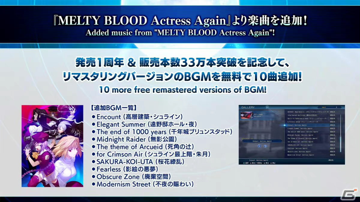 另外,本作将于9月30日迎来发售一周年,为表纪念,官方将在当天为游戏免费追加《MELTY BLOOD Actress Again》等10首系列作品的BGM,感兴趣的玩家可以好好期待一下了。