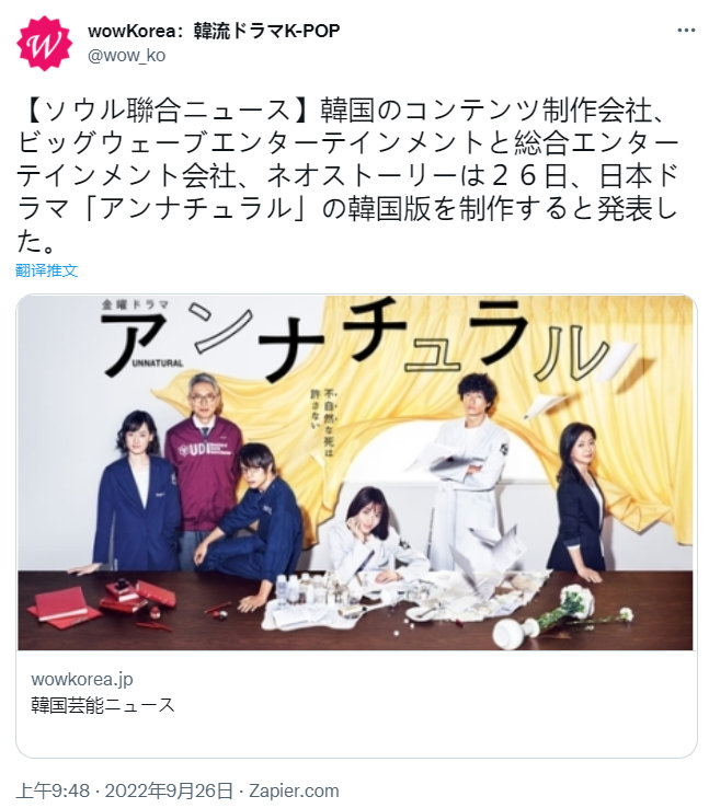 【#非自然死亡将翻拍韩剧#】据韩国媒体报道,TBS系人气日剧《非自然死亡》将被韩国制作公司翻拍成韩剧。韩国娱乐公司 Big Wave Entertainment 和 Neo Story 宣布,他们已经与日本 TBS 签订版权合同,以制作韩国版《非自然死亡》,目前韩版已经在进行剧本编写,搞定剧本后会很快开始选角和拍摄。