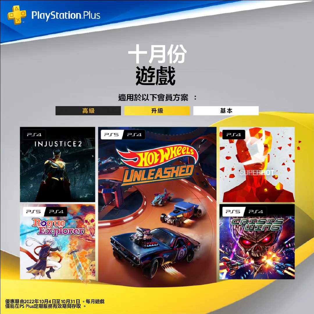 PS4 – 《不义联盟2》 PS4 – 《Superhot》 PS5/PS4 – 《风火轮:爆发》 PS5/PS4 – 《流浪探险家》 PS5/PS4 – 《危机之翼》