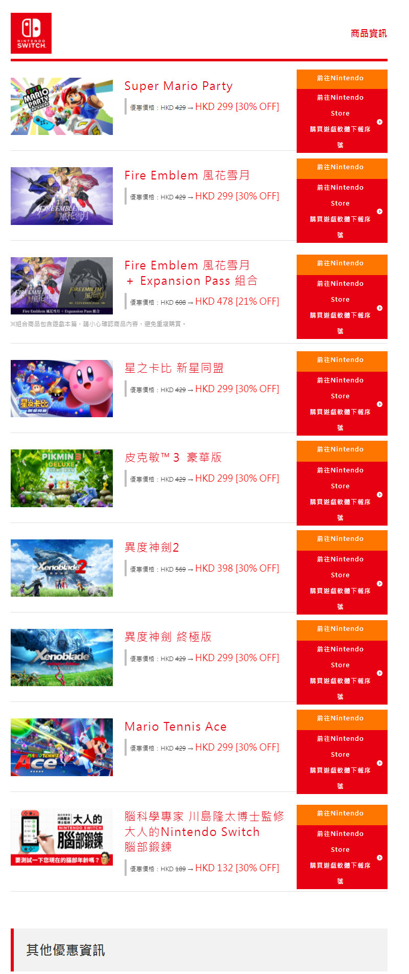 任天堂香港今日宣布港服Nintendo eShop「秋季优惠2022」于2022年9月30日(五)~ 2022年10月13日(四)进行,可以优惠价格在Nintendo eShop和Nintendo Store购买指定下载版游戏。有8款游戏开启折扣,折扣优惠价格如图二显示。