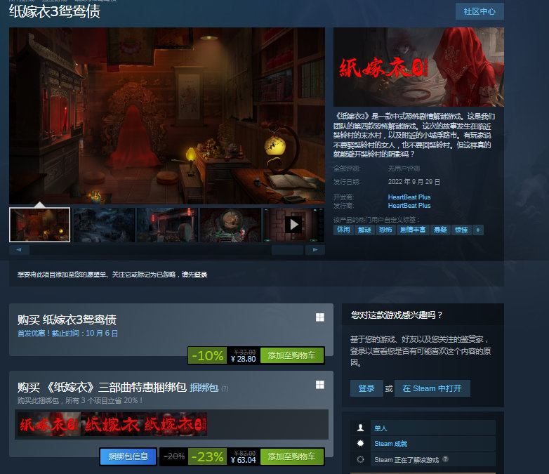 【#纸嫁衣3鸳鸯债Steam发售#】中式恐怖剧情解谜游戏《纸嫁衣3 鸳鸯债》已经于今日在Steam平台发售,国区首发特惠28.8元,还会赠送免费的原画设定集与原声集。