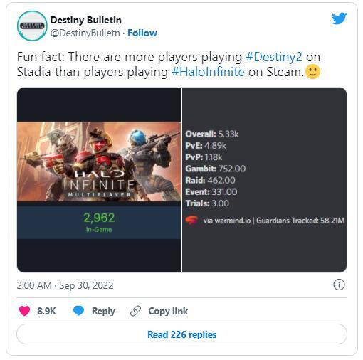 【Stadia《命运2》在线人数竟超过Steam的《光环:无限》】《命运2》是一款由前《光环》开发商Bungie制作的第一人称射击游戏,这款游戏也登陆了谷歌的云游戏平台Stadia。Destiny Bulletin最近发推,向我们透露了一个有趣的事实:那就是尽管Stadia已经官宣将于2023年1月关闭,但最近Stadia上的《命运2》玩家人数却依然要多于Steam上《光环:无限》的玩家人数。