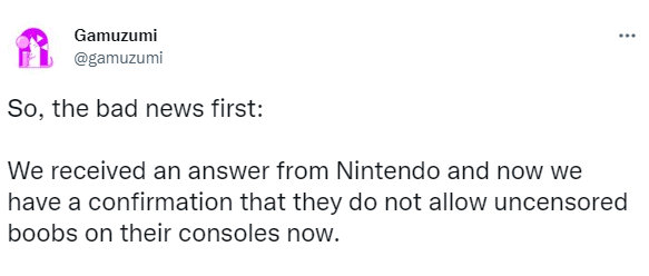 Gamuzumi表示,由于任天堂的政策变动,旗下两款游戏在该平台发行受阻。任天堂回复他们的邮件中说道:“未经审核通过的以动漫女性为特点的游戏内容将不允许出现在Switch平台,因为一些不良内容可能会严重损害品牌的形象并违反相关政策。”