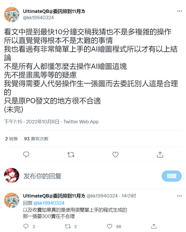 【AI绘图售卖被挂】AI绘图服务日渐流行,不少玩家相信在各地都看到过AI作图,不过AI训练需要投喂,也存在抄袭、未授权等疑虑。最近画师“UltimateQB”在社交媒体分享了截图,有用户利用AI绘图为契机进行售卖/接单,半身像收取新台币300元(约合人民币68元),还可以指定一些基本属性。