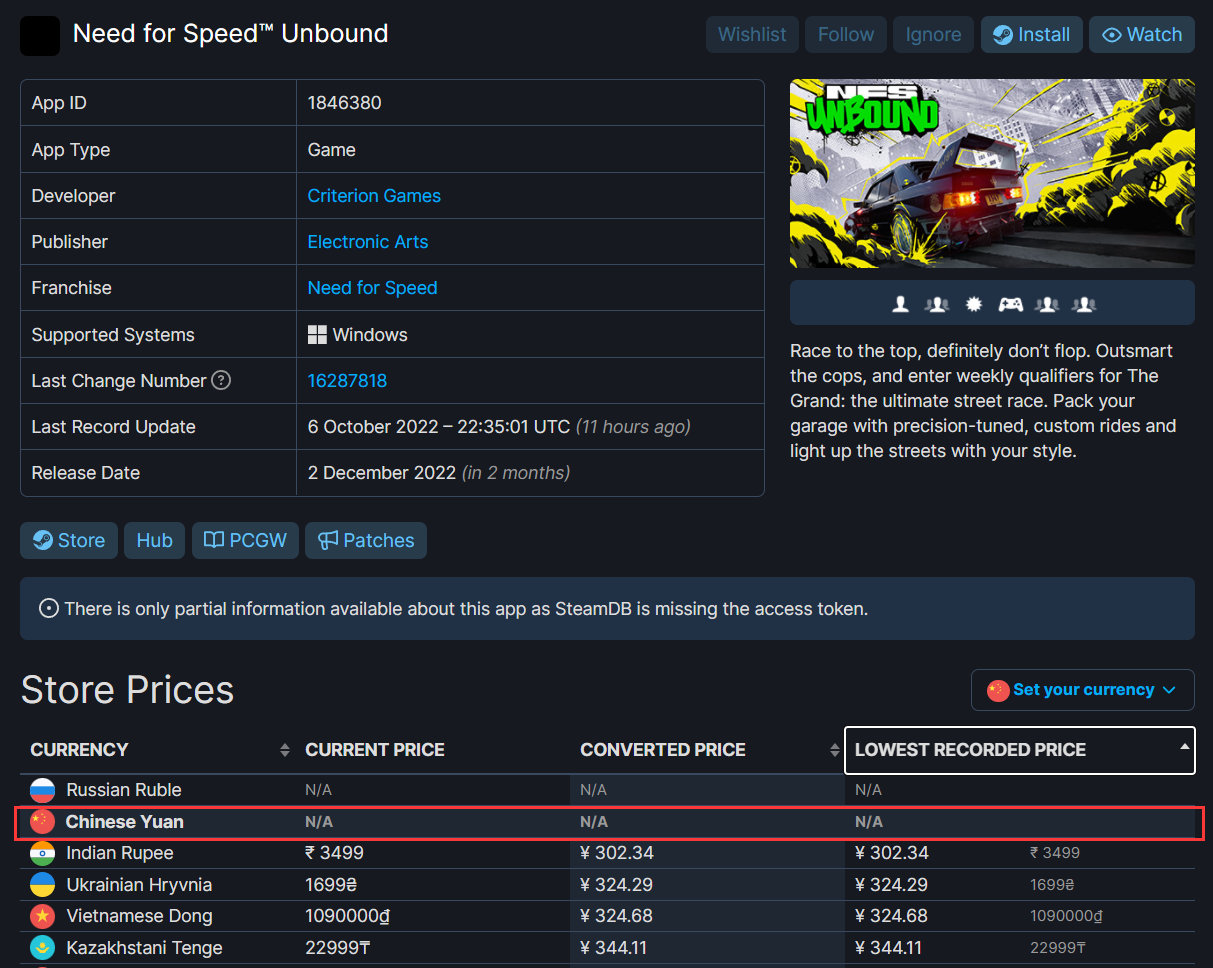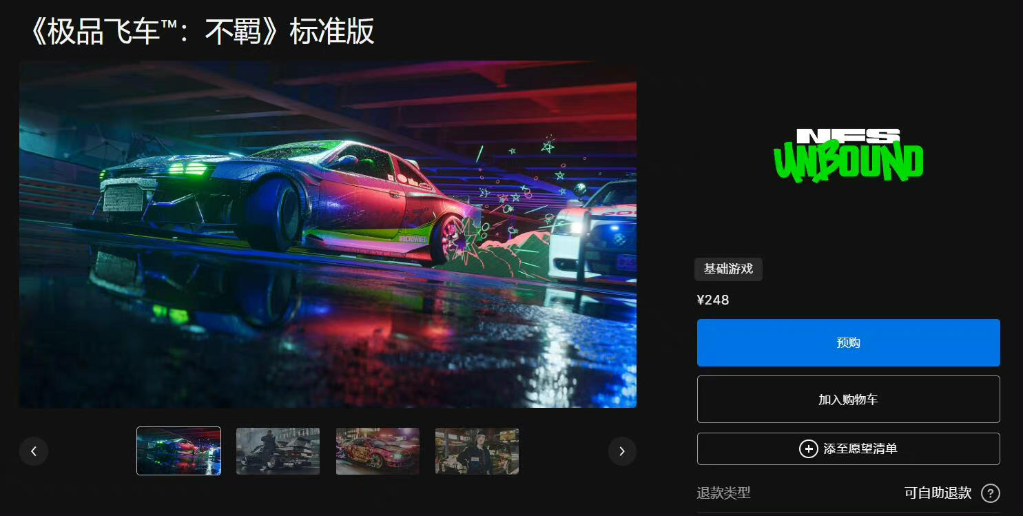 《极品飞车:不羁》游戏自带简繁中文,PC预购目前已经开启,不过目前Steam国区暂时未开放,而Epic国区能正常显示,标准版为248元。尚不清楚Steam和Epic哪个弄错了。