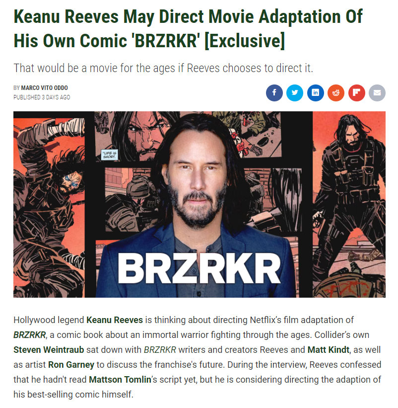 【我演我自己?基努·里维斯有意执导/主演《BRZRKR》】基努·里维斯首次参与编剧、由 Boom 工作室发行的漫画《BRZRKR》目前已经确定将由 Netflix 改编成真人电影,借此拓展其世界观。最近有消息传出,基努·里维斯本人就有意执导/主演这部影片。