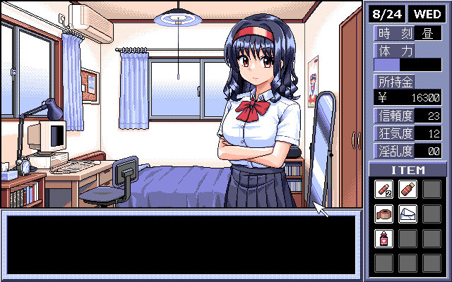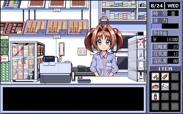本作是对NEC曾经推出的PC-9800系列美少女绅士游戏的致敬,虽然是现代风格的设计,但是颜色的使用和像素画等营造出了怀旧的氛围。游戏右侧除了显示物品和所持金以外,还可以看到疯狂度等状态数值。