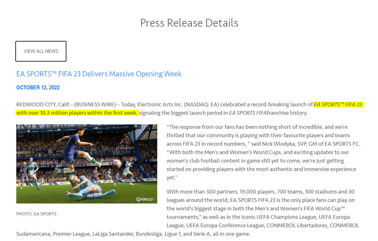 #FIFA23首周玩家突破1030万# EA今日在其官方网站的新闻稿中表示,《FIFA 23》取得了系列最佳的首发成绩,首周玩家就超过了1030万。