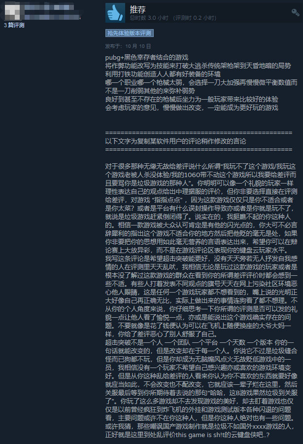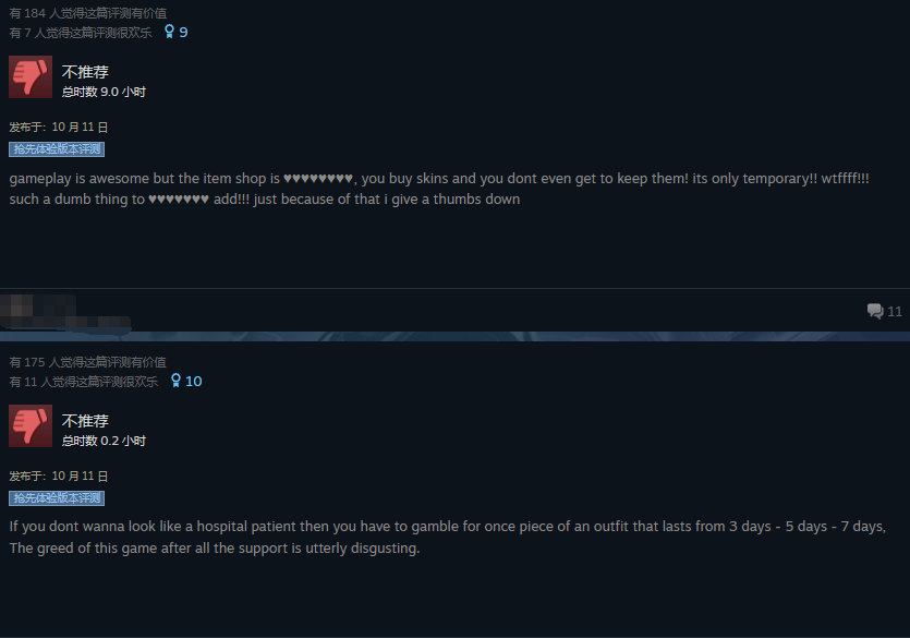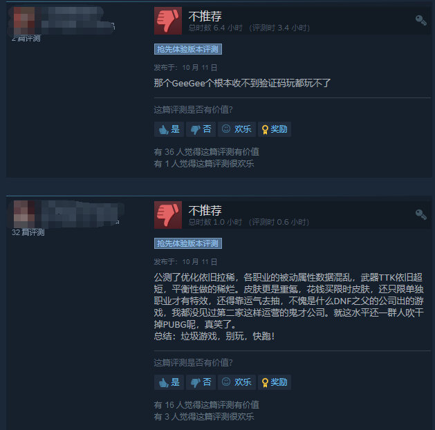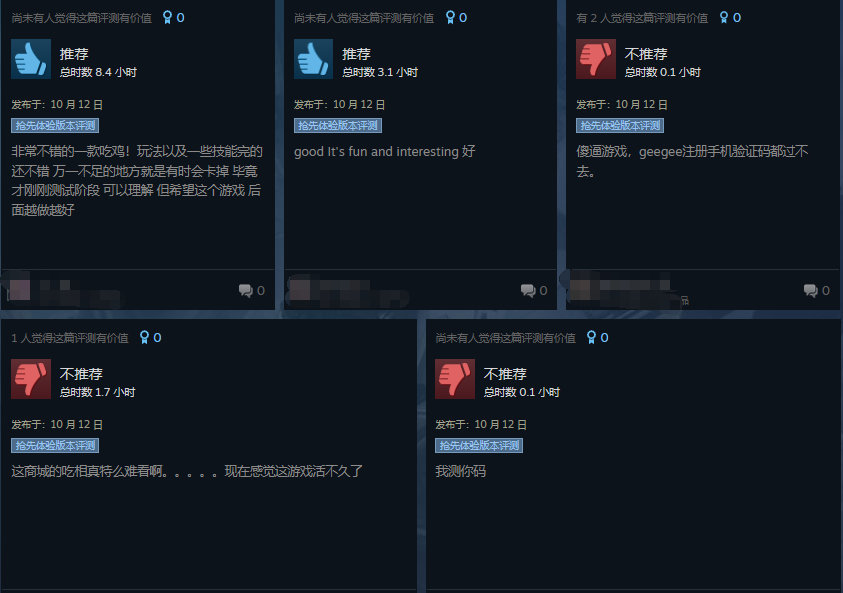 关于本作,国内玩家最为诟病的一点则是,游戏需要注册 GeeGee 平台才能开始游戏,而国内手机号根本无法收到游戏验证码,因此无法体验游戏。而反观国外玩家差评最多的一条则是游戏内的微交易内容,游戏商店中的服装基本都是限时的,抽奖吃相也非常难看。对于好评部分,玩家认为游戏缝合了多款其余经典热门游戏,易上手,玩腻了其他大逃杀的玩家游玩本作会有一定的新鲜感。