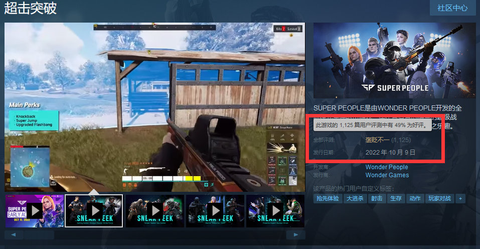 【免费大逃杀新游《超击突破》好评率49%】由韩国工作室Wonder People开发的全新免费大逃杀类游戏《超击突破(Super People)》现已在Steam正式开启抢先体验,截至发稿,本作的好评率仅为49%,拥有超1100条的评测。