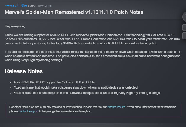 【PC《漫威蜘蛛侠:重制版》成为首个上线DLSS3的游戏】昨日Nixxes发布了PC版《#漫威蜘蛛侠重制版#》的最新补丁(1.1011.1.0),根据补丁说明,这个10月12日的更新补丁为游戏加入了对NVIDIA DLSS 3的支持,官方还计划通过未来的补丁向其他RTX GPU用户提供延迟减少技术NVIDIA Reflex。