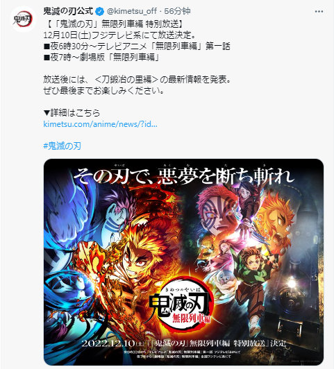 《 》官方今日宣布将于12月10日特别放送《鬼灭之刃》“无限列车篇”,在特别放送活动之后官方将发布《鬼灭之刃》“锻刀村篇”的最新PV。
