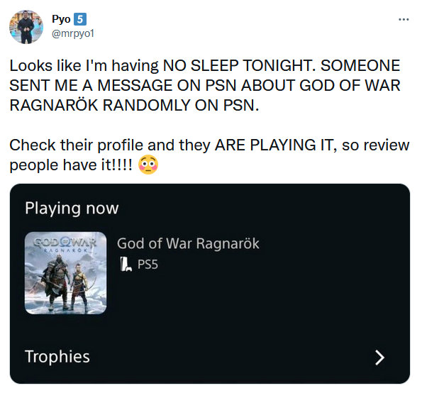 “mrpyo1”发文表示:今晚是个不眠夜了,有人在PSN上给我发了一条关于《战神:诸神黄昏》的信息。检查了他们的个人资料发现他们正在游玩,看来评测人员已经获得他了!