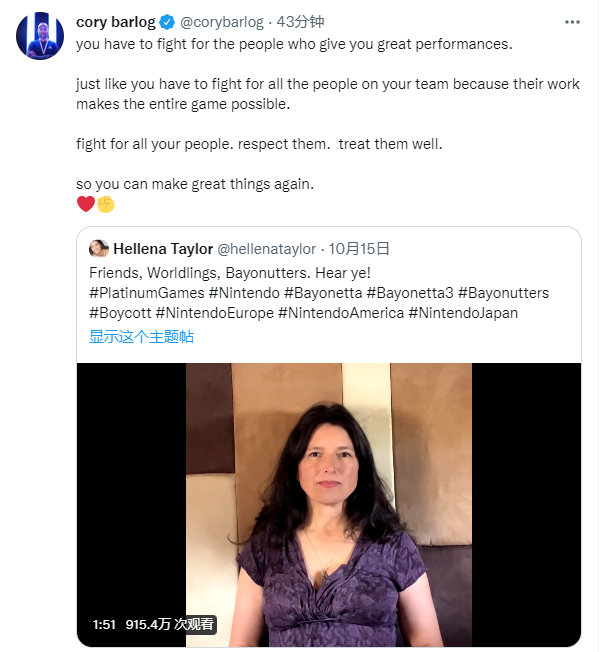 【《战神》总监声援《猎天使魔女》贝姐声优】近期《》贝姐英文声优的风波闹得沸沸扬扬,原版声优Hellena Taylor发文指责白金工作室只肯给出4000美元的报酬,希望粉丝们抵制该游戏。《战神》总监Cory Barlog转发她的推文并表示支持:尊重团队中的每个人,这样才能做出优秀的游戏。