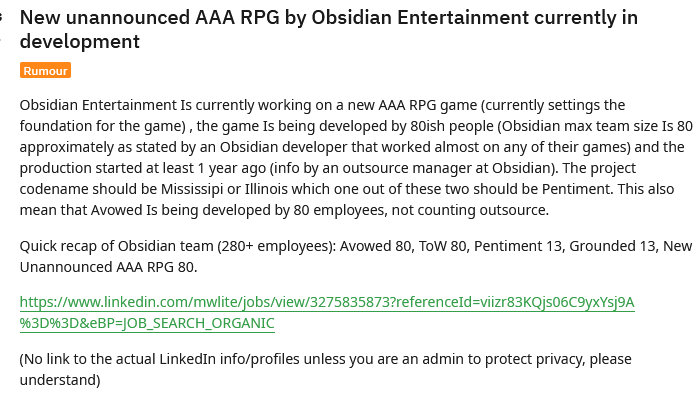 据黑曜石工作室外包经理表示,该项目至少在一年前就开始制作了,项目代号应该是“Mississipi”或“Illinois”,不过早前黑曜石宣布叙事RPG新作《Pentiment》将于11月15日正式发售,而这款游戏的内部代号据悉为 Mississip,因此还在开发中的3A级RPG新作的内部代号大概率是 Illinois。