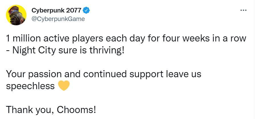 今天CDPR宣布:连续4周之内《赛博朋克2077》每天都拥有超过100万名活跃玩家,夜之城日渐兴旺!玩家的热情与支持让CDPR无限感慨,那种心情无以言表。