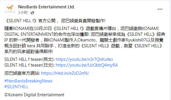 【《寂静岭 f》由国内游戏开发商开发】《寂静岭》系列新作《寂静岭 f》公开更多情报,该作将由国内游戏开发商NeoBards Entertainment(泥巴娱乐)制作。