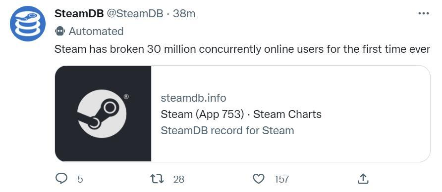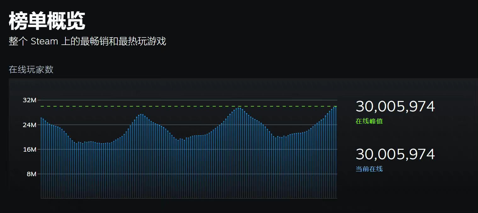目前在Steam平台统计数据页面中可以看到,当前在线的Steam人数为30,005,974。根据Steamdb数据统计,这是Steam历史上第一次达成3000万同时在线的成绩。