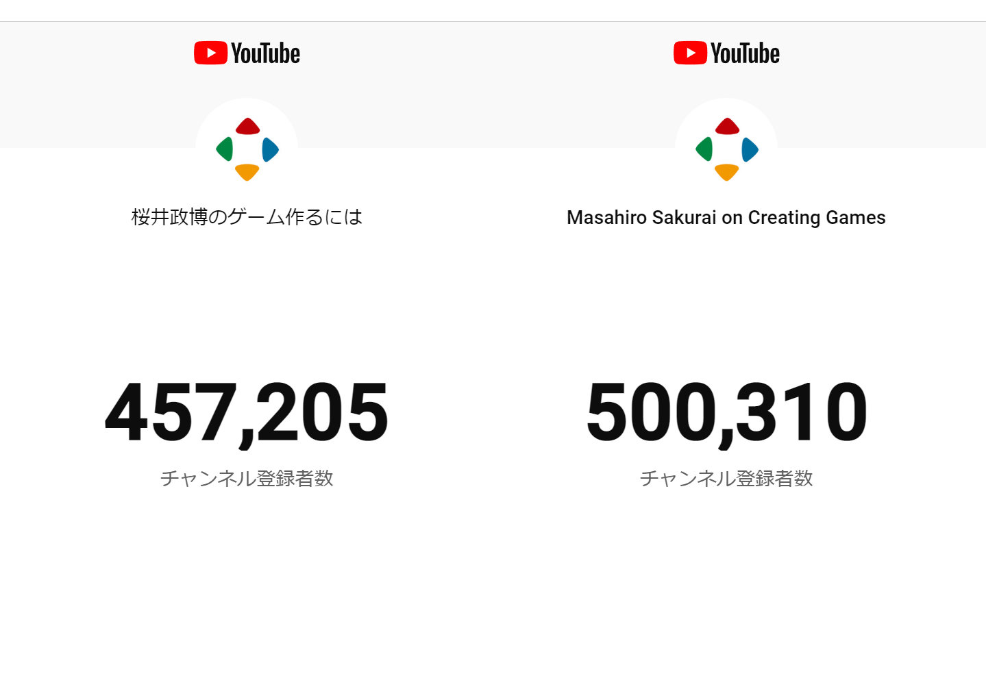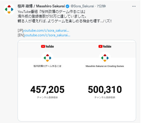游戏制作人樱井政博个人的YouTube英文频道现已突破50万粉丝,日文频道也有45万粉丝,在这频道中樱井政博将分享游戏制作中的趣事。