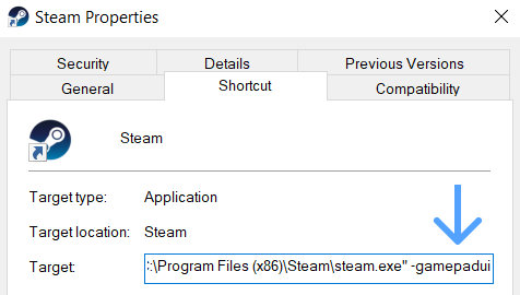 编辑Steam启动快捷方式,添加启动参数:-gamepadui。