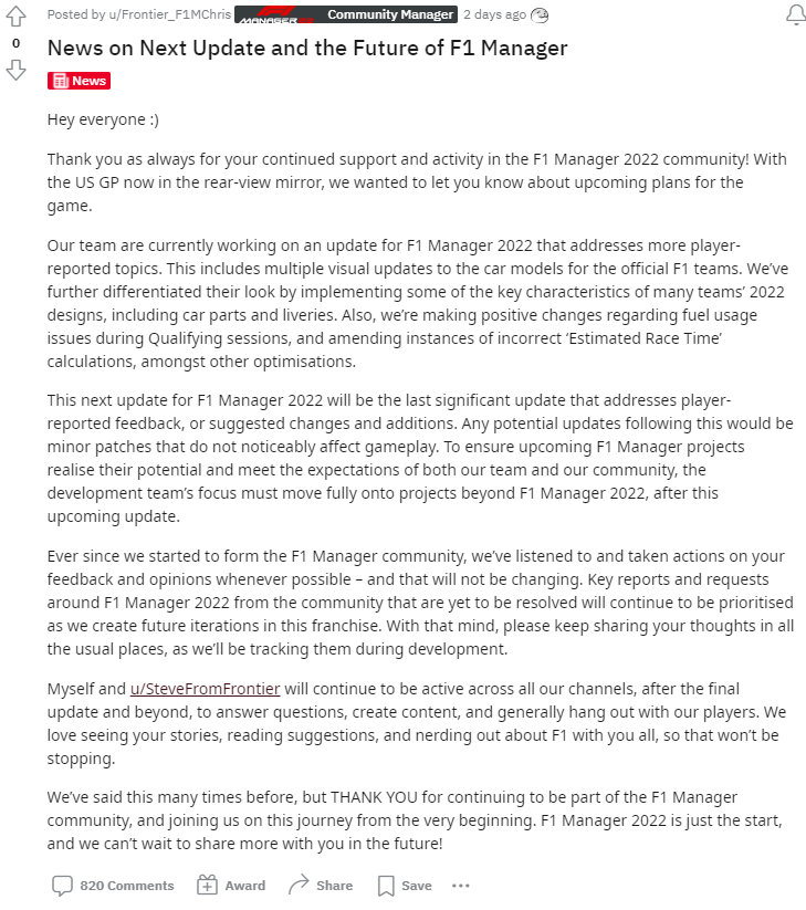 【《F1车队经理2022》发售两个月就要停止更新】开发商 Frontier Developments 近日宣布,即将到来的更新会是《F1车队经理2022》的最后一次主要更新,团队今后打算将重点放在游戏的未来之上。而本作是今年8月22日才发售的新游戏,这次的公告也引起了玩家的不满。不少玩家表示游戏在刚发售时感觉还是半成品,现在也仅仅刚符合预期而已。