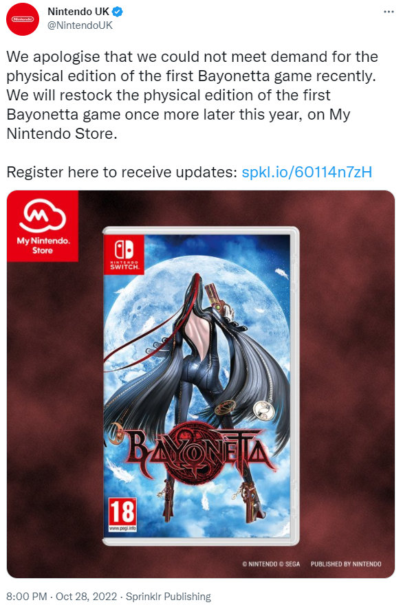 而《猎天使魔女》和其续作《猎天使魔女2》最初只以数字版的形式推出,在10月25日终于推出了实体版本,不过貌似其火爆程度也超越了任天堂的预期。目前两个前作都已经更新中文,《》也已经于近日发售,评价十分不错。