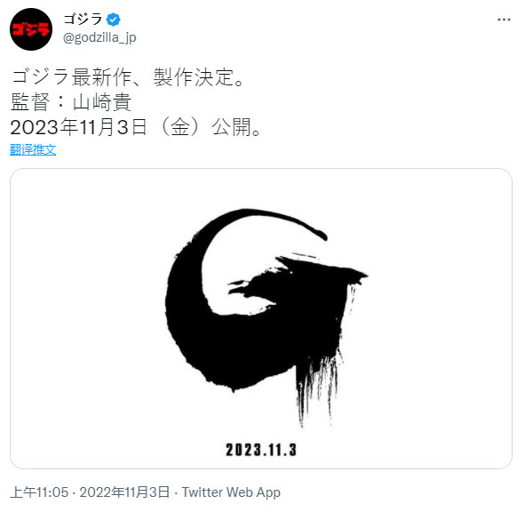 #哥斯拉新作公布# 《哥斯拉》最新作制作决定,由《哆啦A梦:伴我同行》《阿基米德大战》导演 山崎贵 执导,预计会在2023年11月3日上映。