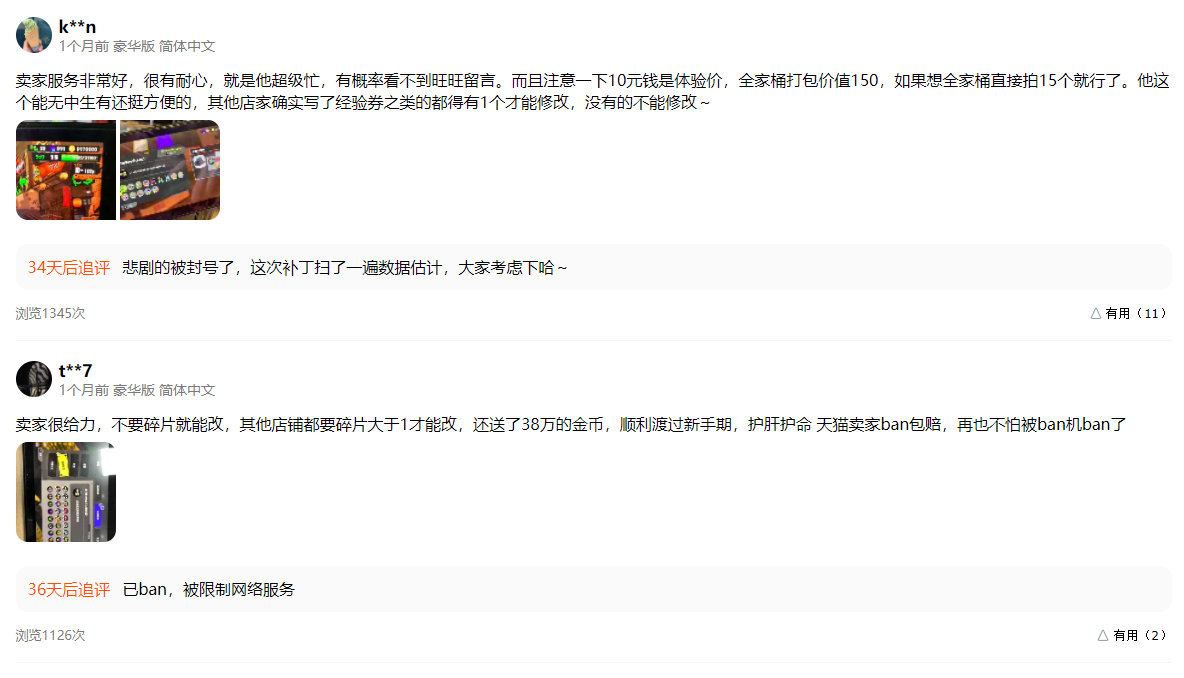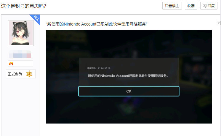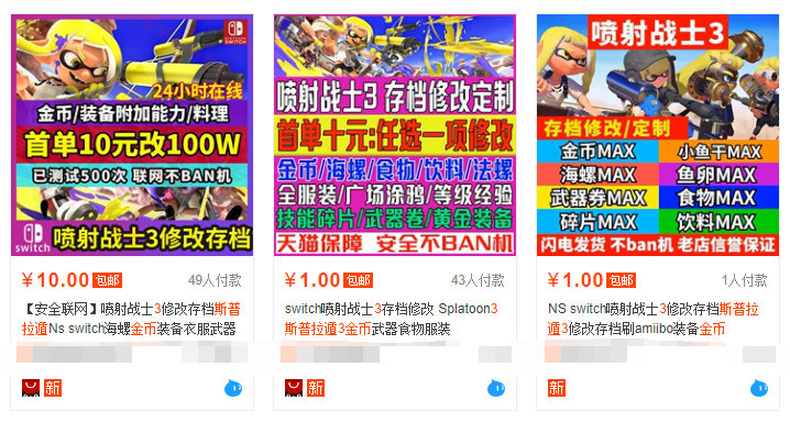【大量《斯普拉遁3》玩家买金被封】近日有不少玩家在贴吧反馈,自己的《》显示“所使用的Nintendo Account已限制此软件使用网络服务”,已经被ban游戏(不让联机游玩)。而根据近期玩家发布的帖子来看,这些玩家多为修改存档、金币、武器、食物、服装的用户,某宝店铺下面也出现了众多被ban游戏的评论。
