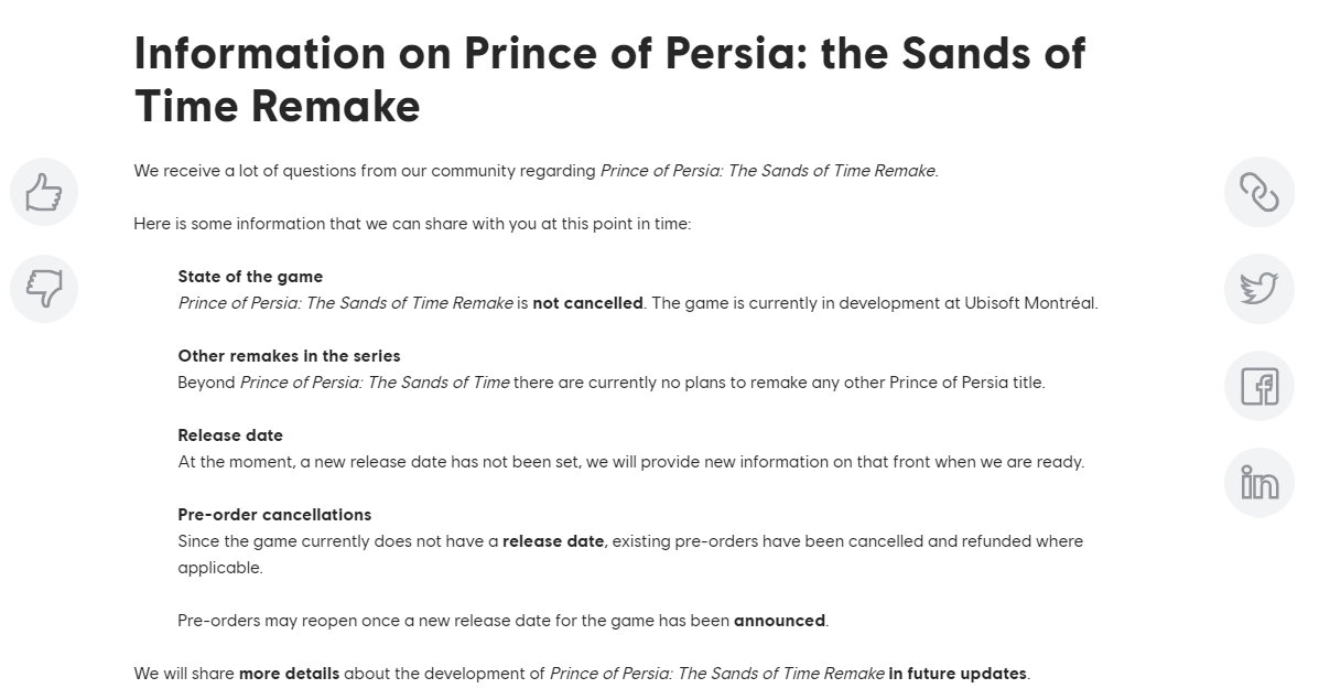 育碧官网发布文章,公布了一些新消息。《波斯王子:时之砂 重制版》并未取消开发,早在5月份就不再由印度工作室负责,已经转给能力较强的蒙特利尔工作室。《波斯王子》的其他游戏暂时没有重制计划。因为尚未确定发售日期,因此提前预购的玩家可随时退款。待发售日公布后,预购将会再次开启。