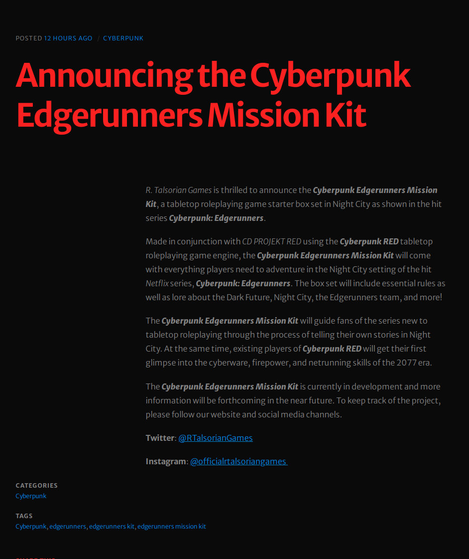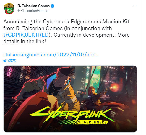 【#赛博朋克边缘行者将推出桌游# 】R. Talsorian Games今日宣布将和CDPR联手开发《赛博朋克:边缘行者》的TRPG游戏,游戏将包含基本规则书以及关于夜之城和“边缘行者”小队的资料。