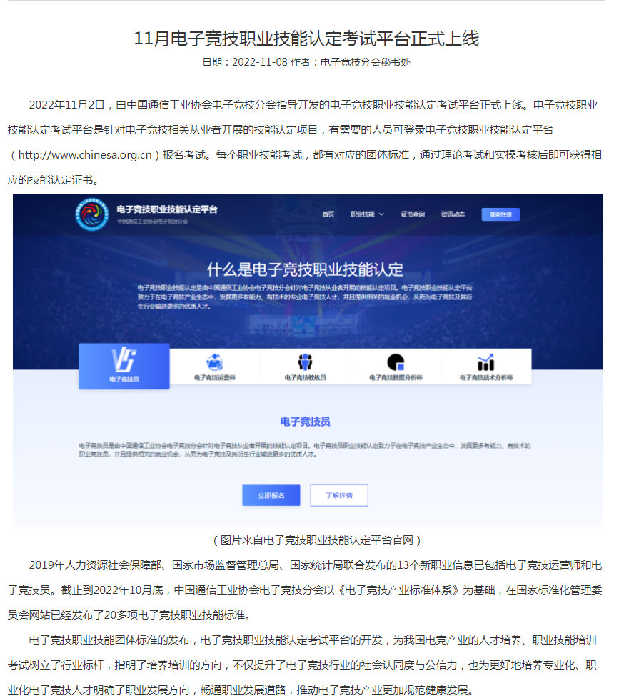 【#电子竞技职业技能认定平台上线#】中国通信工业协会电子竞技分会近日发布公告,宣布2022年11月2日,由中国通信工业协会电子竞技分会指导开发的电子竞技职业技能认定考试平台正式上线。