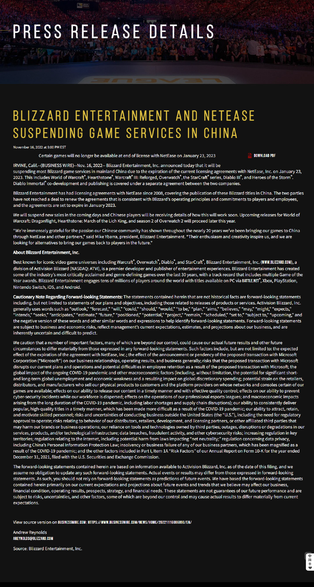 【#暴雪将在中国暂停多款游戏服务#】暴雪娱乐今日宣布由于和网易的授权协议将于2023年1月到期,且双方尚未就符合暴雪运营原则和对玩家及员工承诺的协议续签达成协议。
