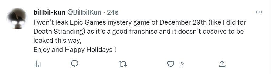 不仅如此,billbil-kun还透露他已经知道30日Epic的喜加一游戏是什么,不过他不打算说出来,因为那是一个“很好的游戏系列,不应该被这样泄露出来”。看起来12月30日的喜加一游戏可能是一个重磅大作,所以他想要保留一点惊喜。