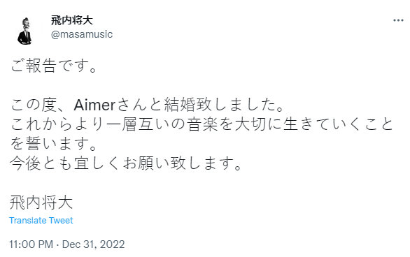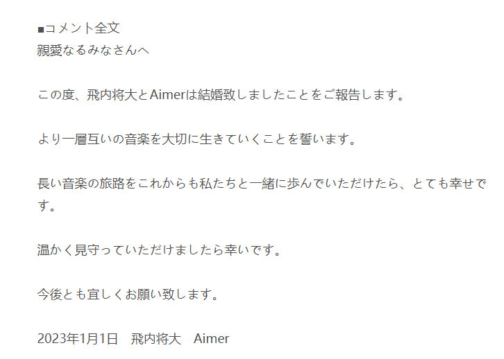 歌手 Aimer 宣布与作曲家 飛内将大 结婚!