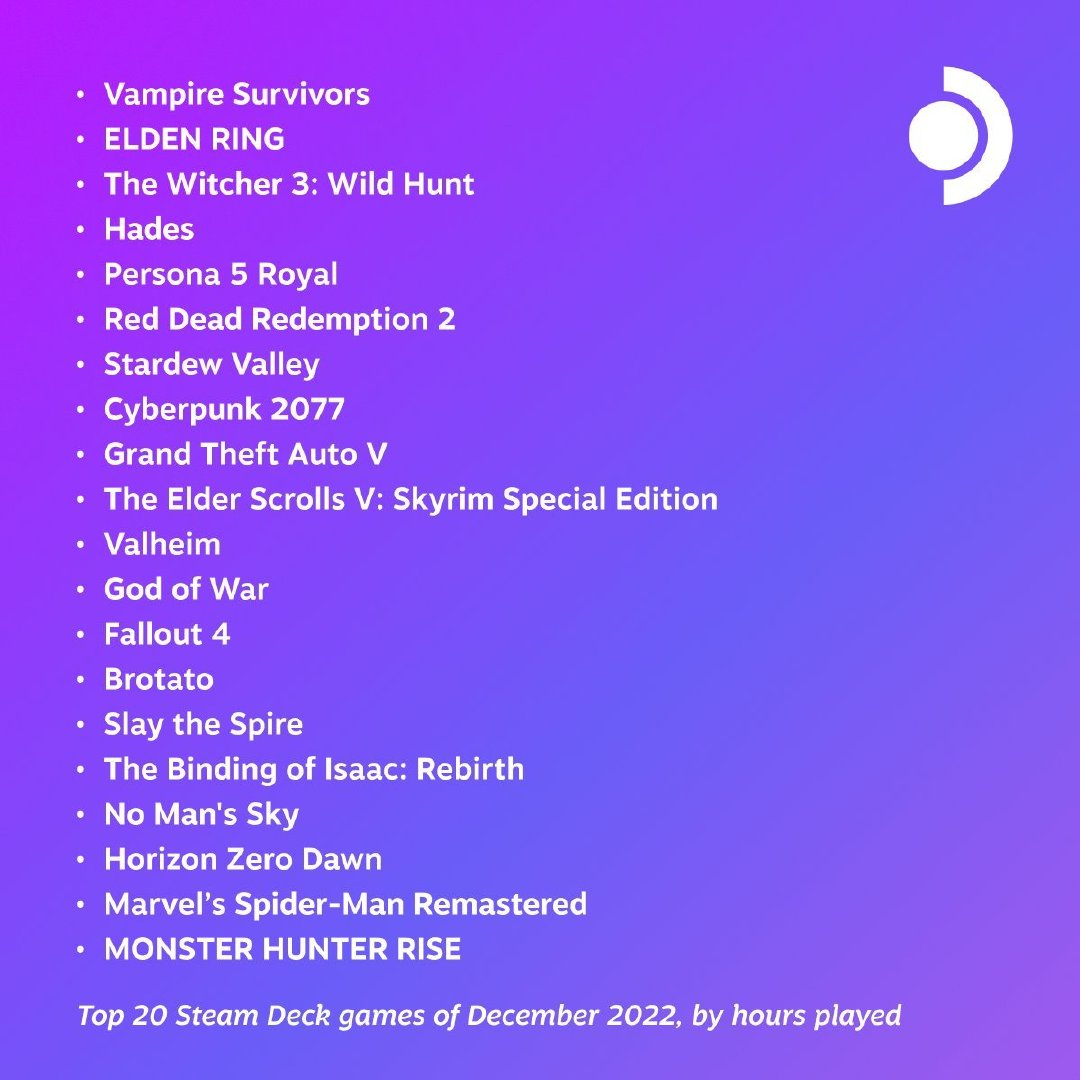 【《吸血鬼幸存者》连续5个月称霸Steam掌机】新的一年已经到来!V社今天公开了Steam Deck掌机的12月份热门游戏榜Top20。该榜单根据玩家们的累计游戏时长评选而出,其中大家玩的最多的游戏依然是《吸血鬼幸存者》!自去年8月开始,这款游戏就一直是Steam Deck第一热门的游戏,热度始终不减。