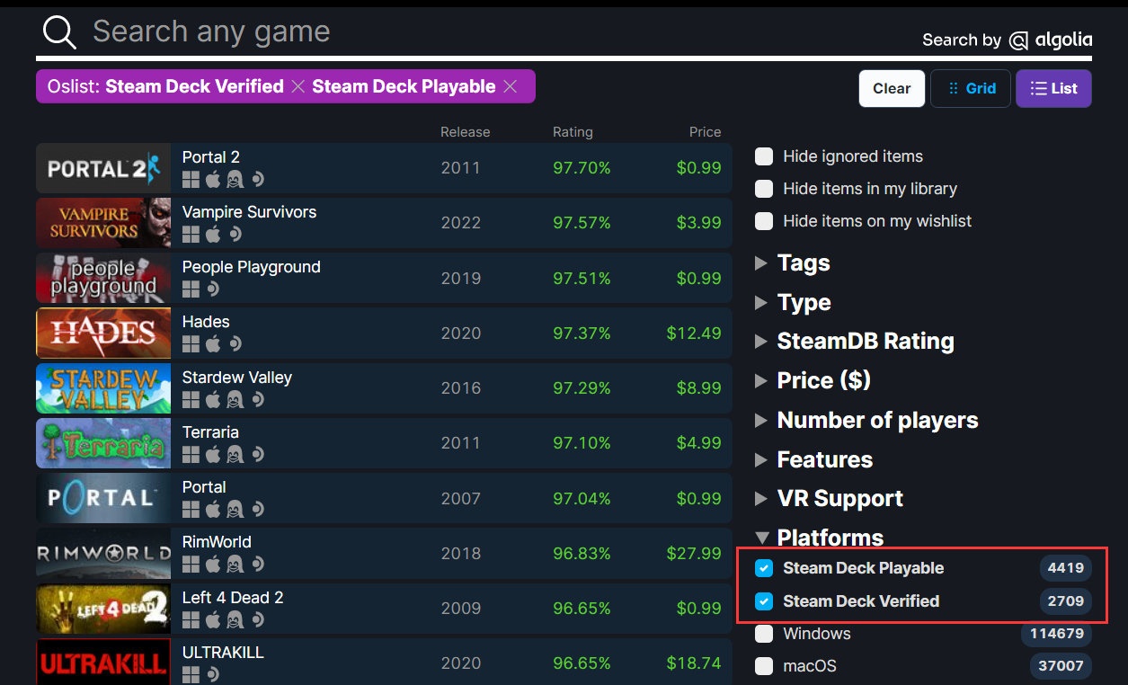 根据记录Steam相关内容的第三方网站SteamDB显示,Steam Deck上现在有4419个“可玩”游戏,另有2709个为“通过验证”,在撰写本文时总共有7128个游戏兼容Steam Deck。