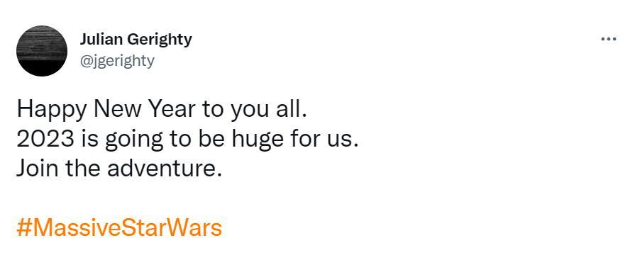 育碧创意总监Julian Gerighty今天在社交媒体上表示:“祝大家新年快乐!2023对我们将会是非常重要的一年。一起加入冒险吧。”同时他还配上了育碧《星球大战》游戏的logo图片。看这样子,他们很可能会在今年揭开这款游戏的庐山真面目。
