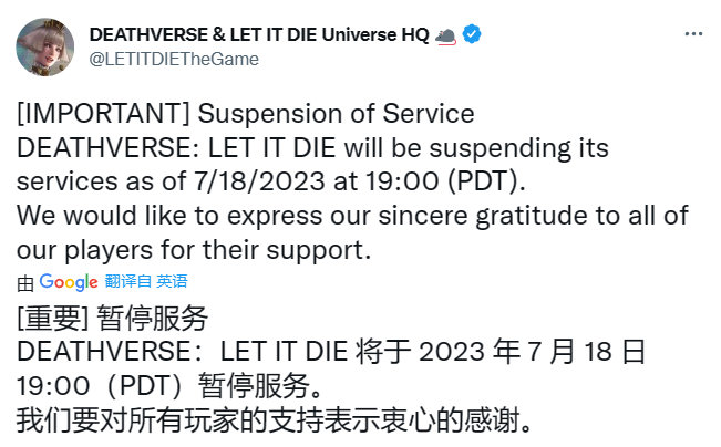 【大逃杀游戏《让它去死》宣布停服 将重新开发后再发布】动作大逃杀游戏《死亡之旅:让它去死(Deathverse:Let it Die)》官方今日宣布,本作服务器将于2023年7月18号关闭,从2月7日起,游戏内货币将暂停销售。距离游戏发售(2022年10月5号)不到一年。但官方称会重新开发本作,并重新发布。