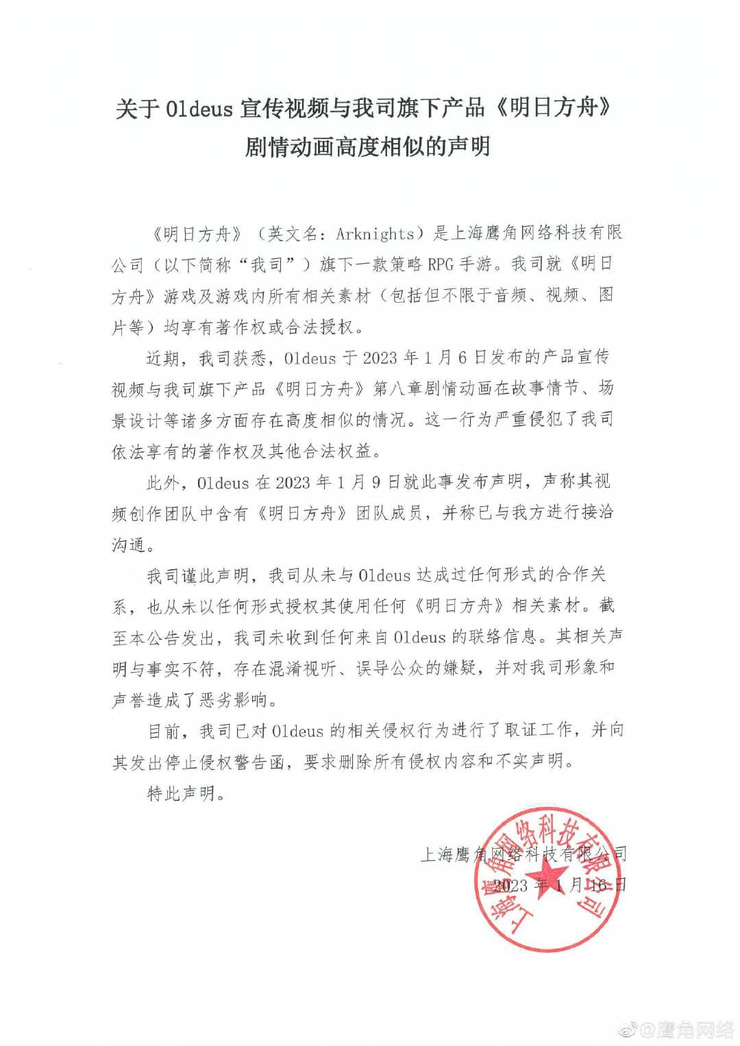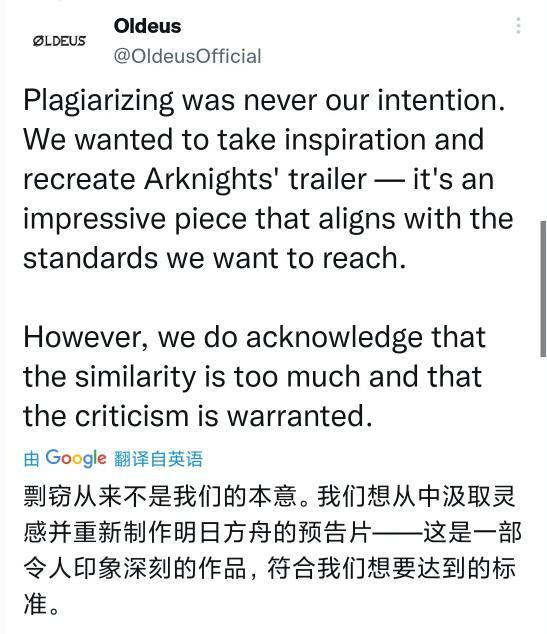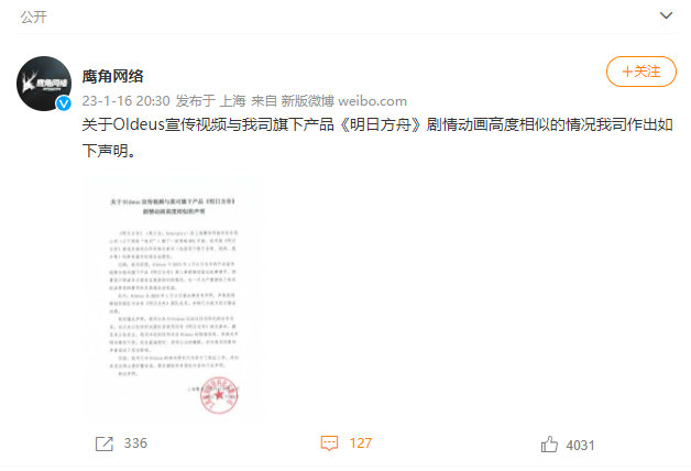 【#明日方舟回应被抄袭#】鹰角网络今日对国外游戏厂商「OldeusOfficial」游戏宣传视频与《明日方舟》剧情动画高度相似发布声明。