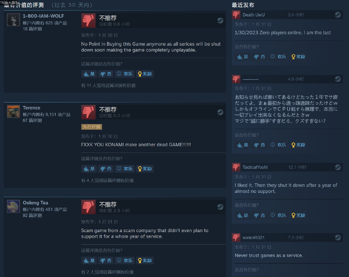 在公告发布后,《犯罪观察》的Steam最近评测也变为“多半差评”,玩家们对科乐美的做法感到很愤怒,因为《犯罪观察》才刚刚上线不到一年时间,结果就直接关服停运了,而且之前花了钱的玩家也没法再继续游玩了。
