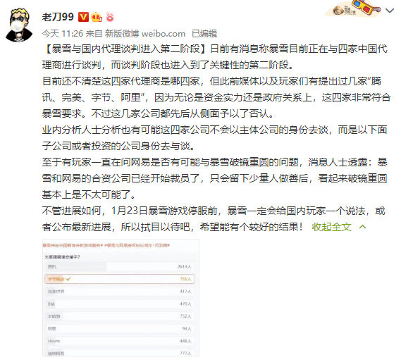 【传暴雪与国内代理谈判进入第二阶段 候选四家但无网易】据知名《》玩家 老刀99 透露消息称,暴雪目前正在与四家中国代理商进行谈判,而谈判阶段也进入到了关键性的第二阶段。