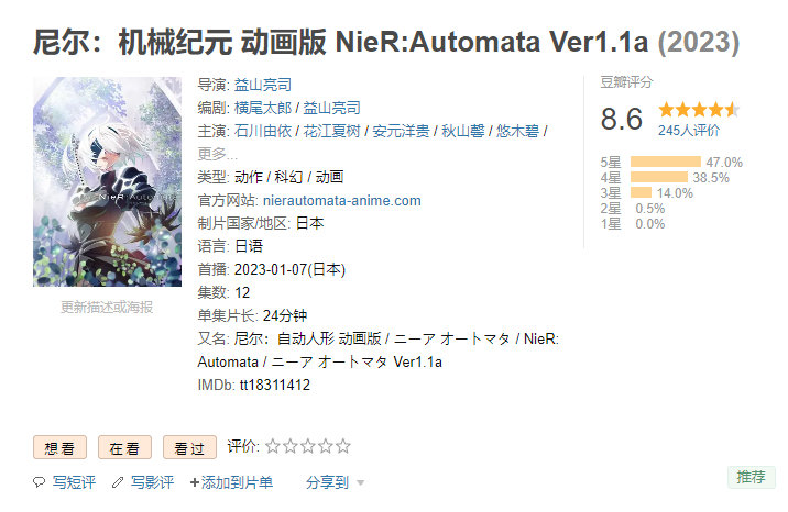 【《尼尔:机械纪元》TV动画豆瓣8.6分:还原度颇高】《 Ver1.1a》TV动画第一集已正式上线,由于和游戏的高度一致性与还原程度,该动画受到了很多粉丝的关注和好评。目前动画的豆瓣评分也已经解禁,虽然评价人数不算多,但是也获得了8.6分的高分。