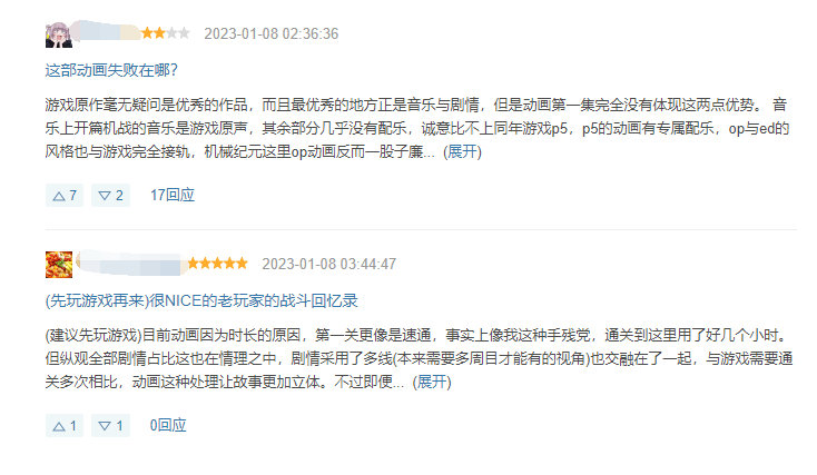 评价中也多为《尼尔:机械纪元》游戏玩家,并表示动画相当尊重原著,BGM也非常熟悉,不过画面还是略显粗糙,感觉不是很富有。