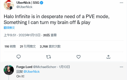 令人意外的是,《光环:无限》的Forge首席设计师Michael Schorr回复了他,表示他们“已经在做PVE模式了”。
