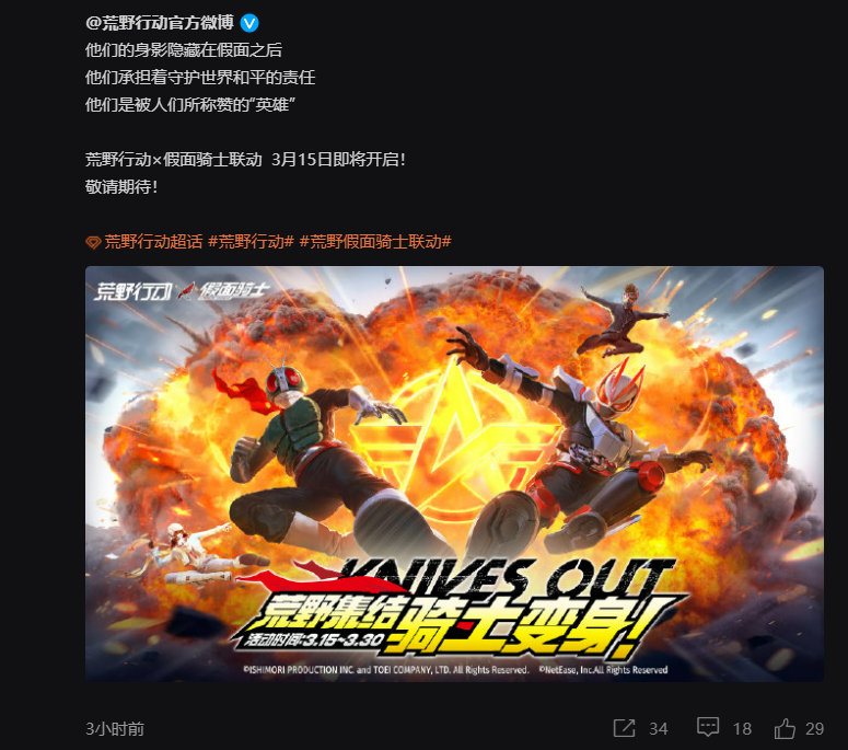 【Geats来大逃杀了!#荒野行动联动假面骑士#】网易旗下大逃杀手游《荒野行动》在日本十分受欢迎,并且与多部日本动漫进行过联动。今天游戏的官方微博宣布将在3月15日开启与日本三大特摄之一的《假面骑士》开启联动!